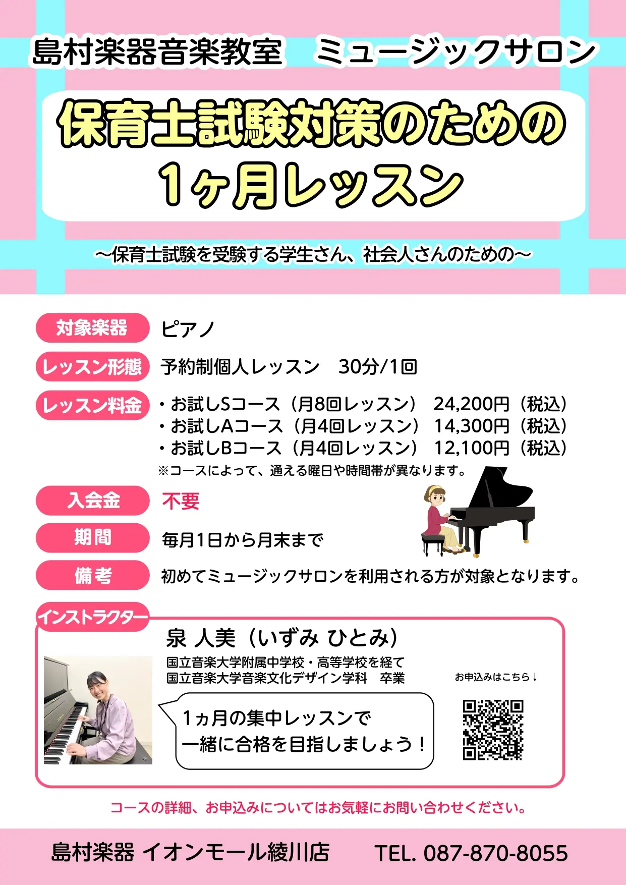 1ヶ月で保育士試験の課題曲を弾けるようにレッスンしていますので、担当インストラクターと一緒に合格を目指しましょう!