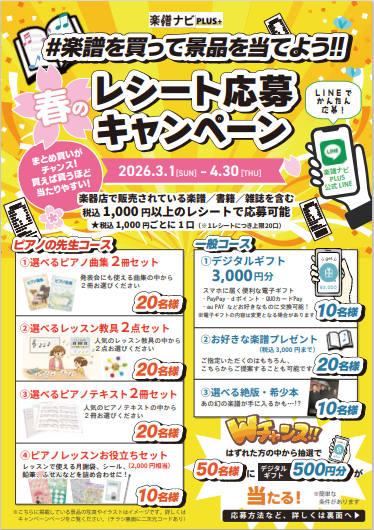 【全国の楽器店対象】楽譜を買って景品を当てよう!楽譜ナビPLUS 春のレシート応募キャンペーン2026