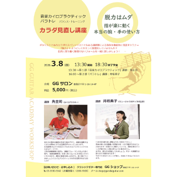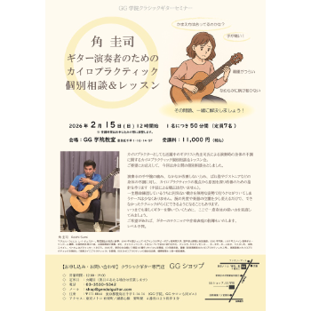 カイロプラクターとしても活躍中のギタリスト角圭司氏による演奏時の身体の不調に関するカイロプラクティック個別相談&レッスン会。