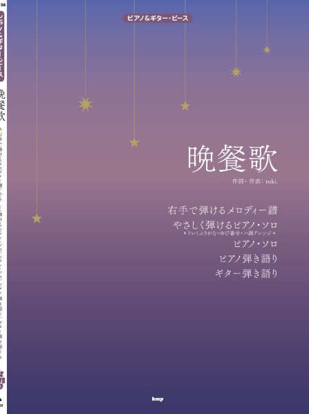 シンガーソングライター tuki. の大ヒット曲「晩餐歌」を、右手で弾けるメロディー譜、やさしく弾けるピアノ・ソロ、ピアノ・ソロ、ピアノ弾き語りと、ギター弾き語りの5バージョンで収載しました。